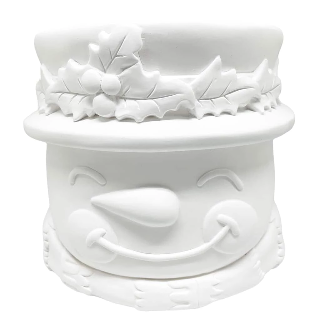 Add your own special flourish to your holiday dΓ©cor with this unfinished plaster snowman container. All decked out with traditional details, decorate this charming bowl with paint, glitter, and other embellishments to bring Christmas cheer to your home for years to come.