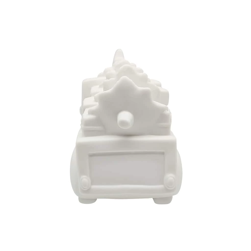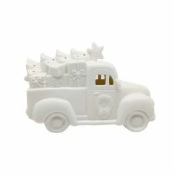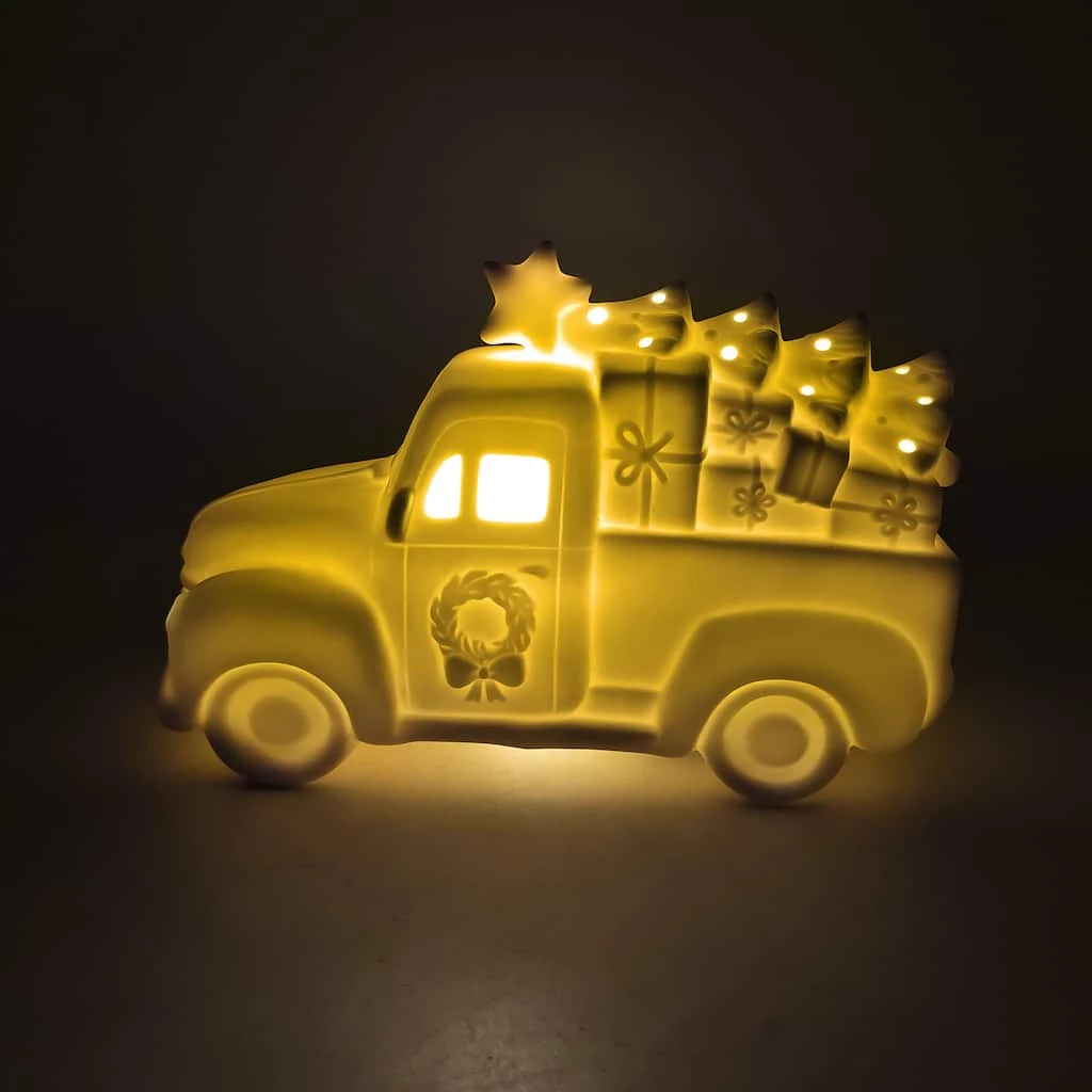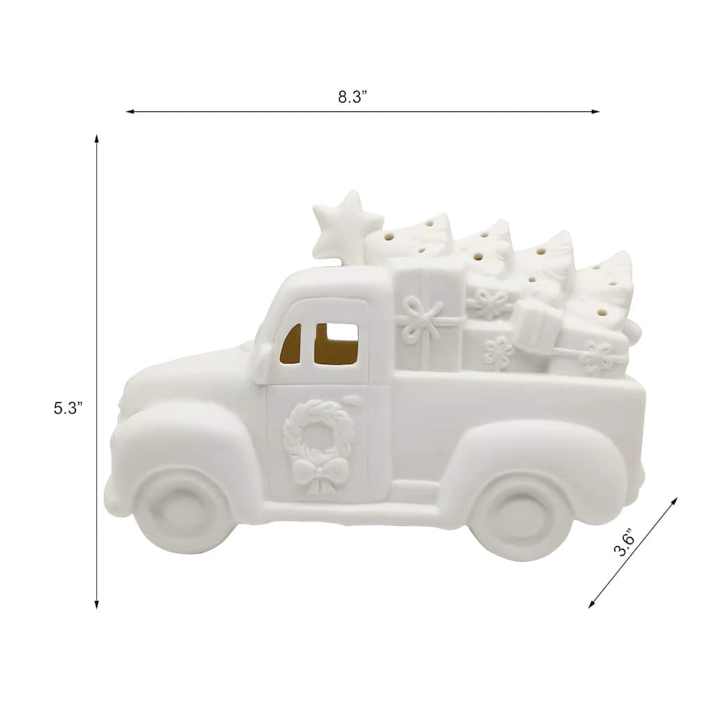Add your own special flourish to your holiday dΓ©cor with this unfinished ceramic truck. All decked out with a wreath and a tree, decorate this LED lighted accent piece with paint, glitter, and other embellishments to bring Christmas cheer to your home for years to come.