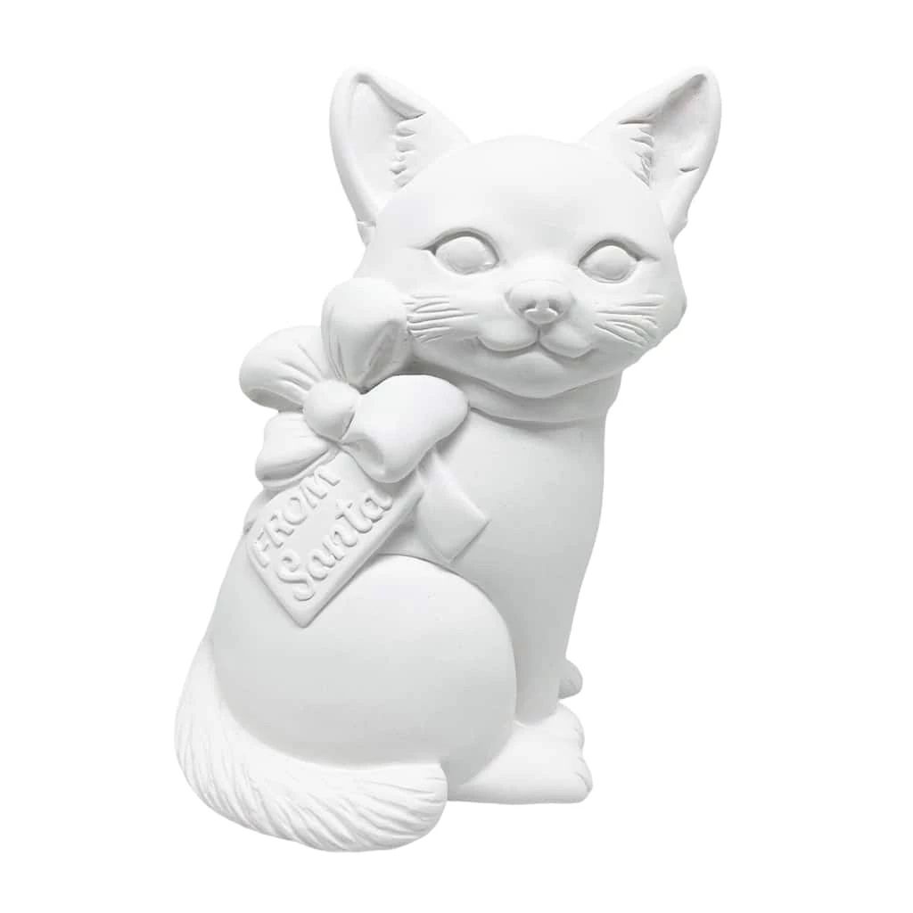 Add your own special flourish to your holiday dΓ©cor with this unfinished plaster cat. All decked out with a big bow and gift tag, decorate this charming accent piece with paint, glitter, and other embellishments to bring Christmas cheer to your home for years to come.