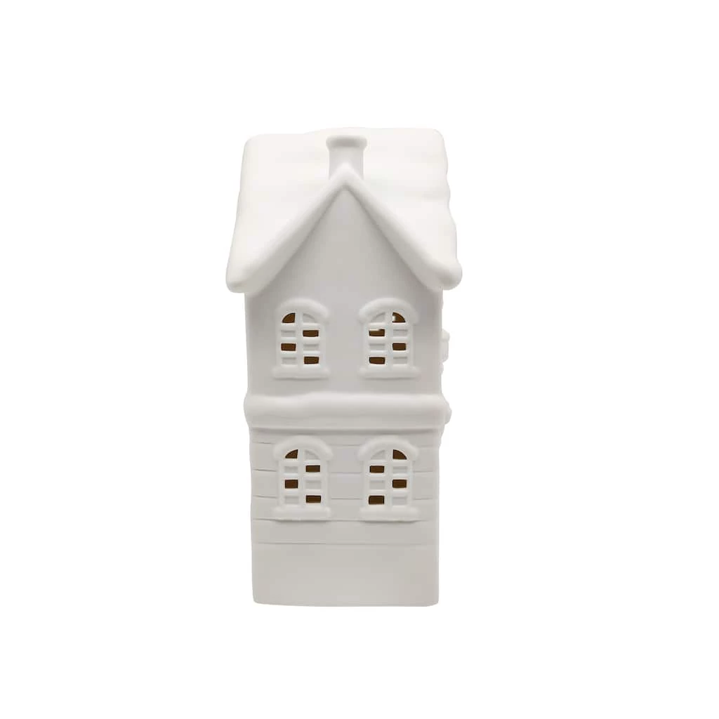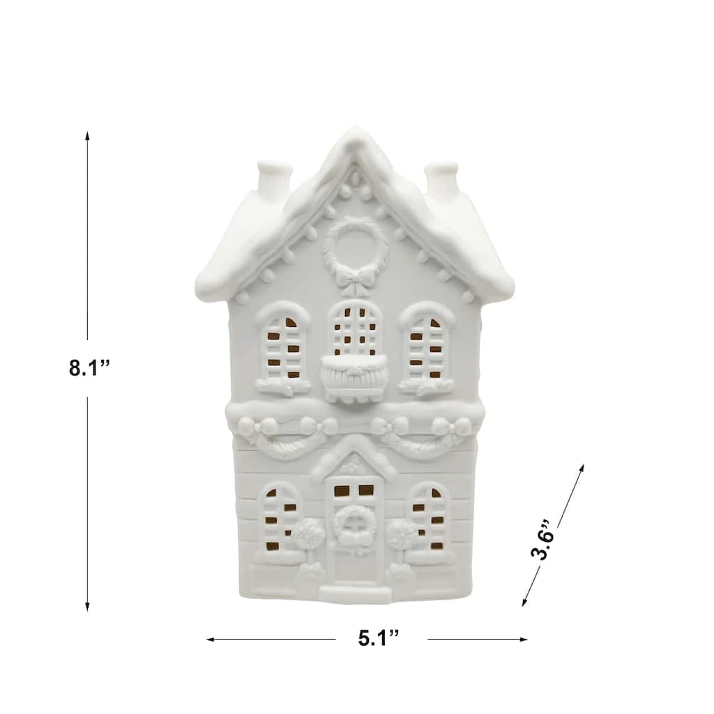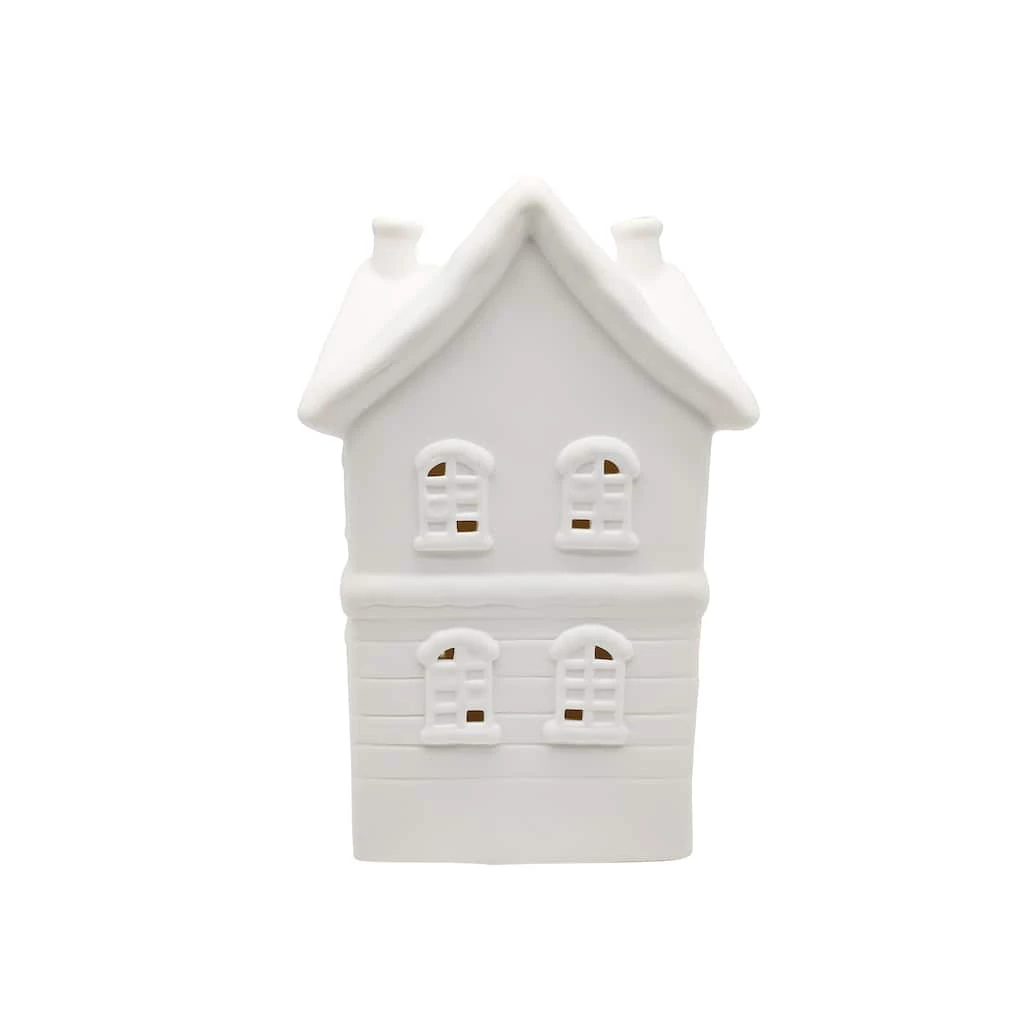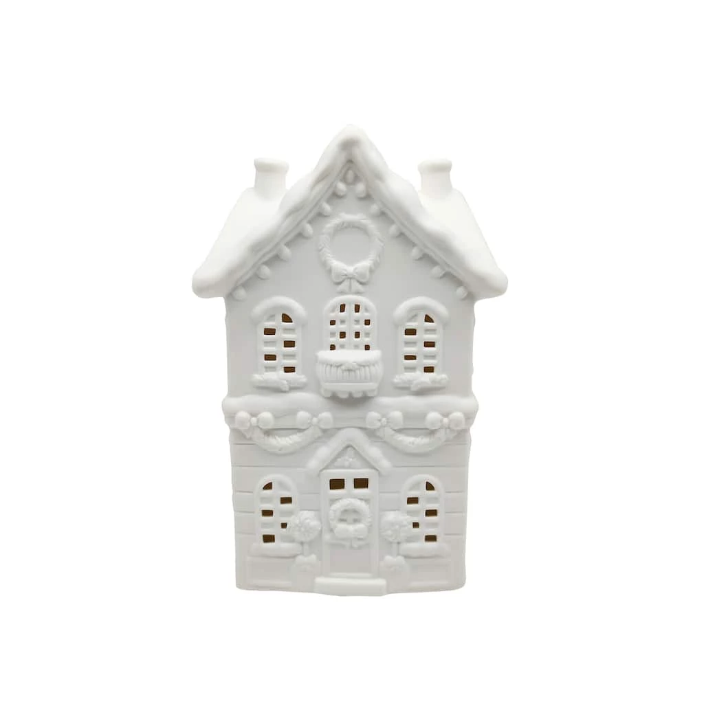 Add your own special flourish to your holiday dΓ©cor with this unfinished ceramic townhome. All decked out with lights, garlands and wreaths, decorate this LED lighted accent piece with paint, glitter, and other embellishments to bring Christmas cheer to your home for years to come.