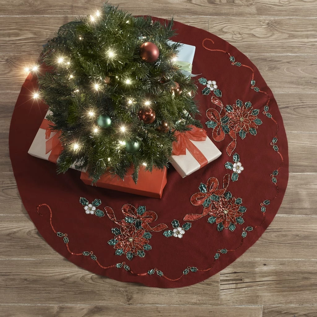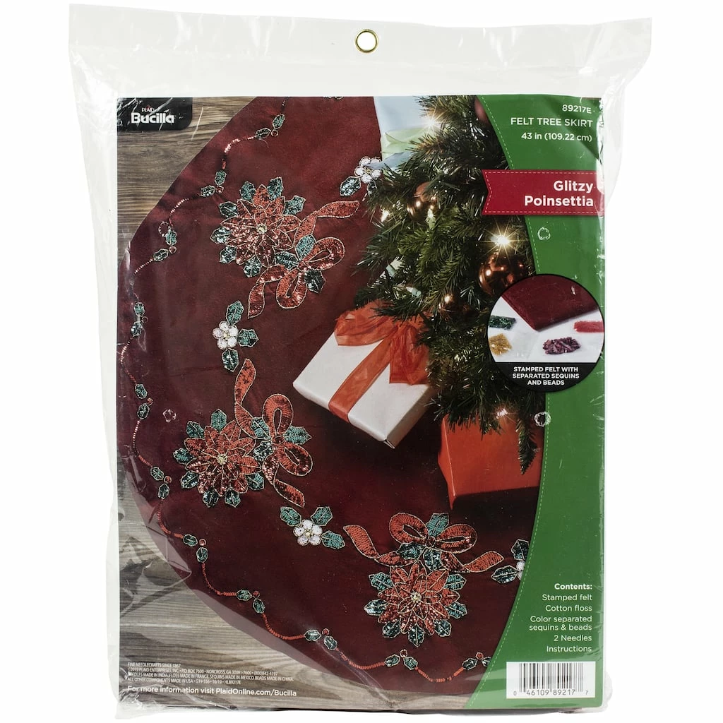 Make a round tree skirt with this great kit! This package contains stamped felts, cotton floss, color separated sequins and beads, two needles, and instructions.