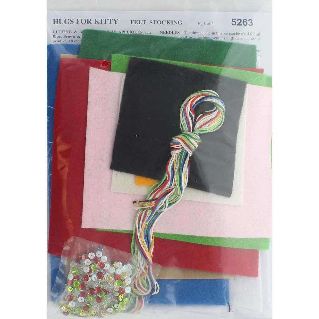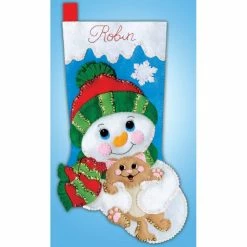 Design Works kits include what you need for special projects. This blue and white felt applique stocking features a snowman cuddling a kitten. There is a space at the top of the stocking to add a name.