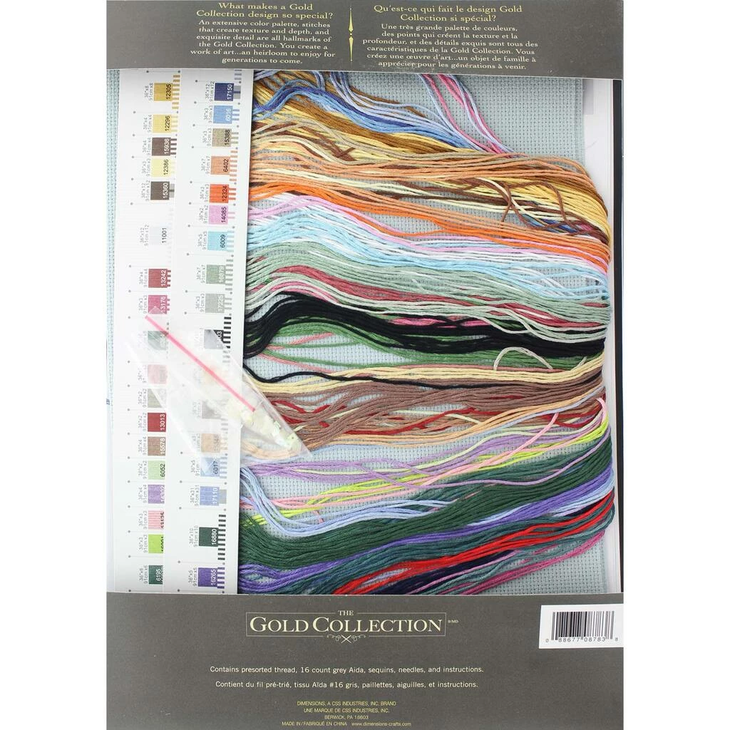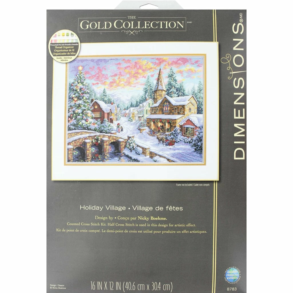 Dimensions Cross Stitch Kits contain everything you need to create a beautiful piece of stitchery art. Cross stitch can be done on even-weave fabric following a print-out grid of the pattern-called counted cross stitch, or on pre-printed fabric-called stamped cross stitch. The Gold Collection Holiday Village design has a snowy village scene with buildings and trees decorated for the holiday.
