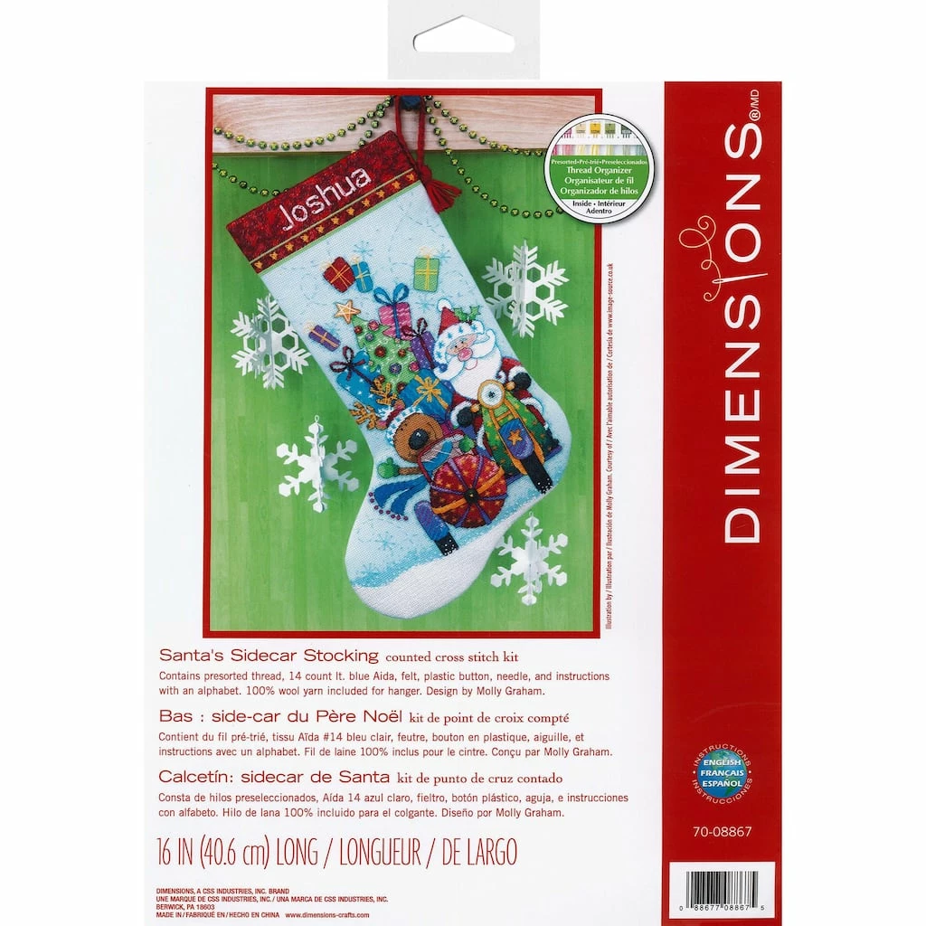 Dimensions Cross Stitch Kits contain everything you need to create a beautiful piece of stitchery art. Cross stitch can be done on even-weave fabric following a print-out grid of the pattern-called counted cross stitch, or on pre-printed fabric-called stamped cross stitch. The Santa’s Sidecar stocking design features Santa driving a motorcycle with a reindeer in the sidecar. Presents and a Christmas tree decorate the background.