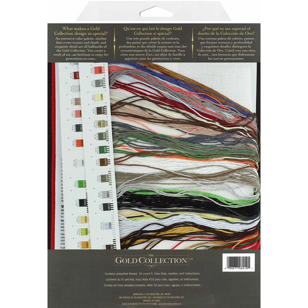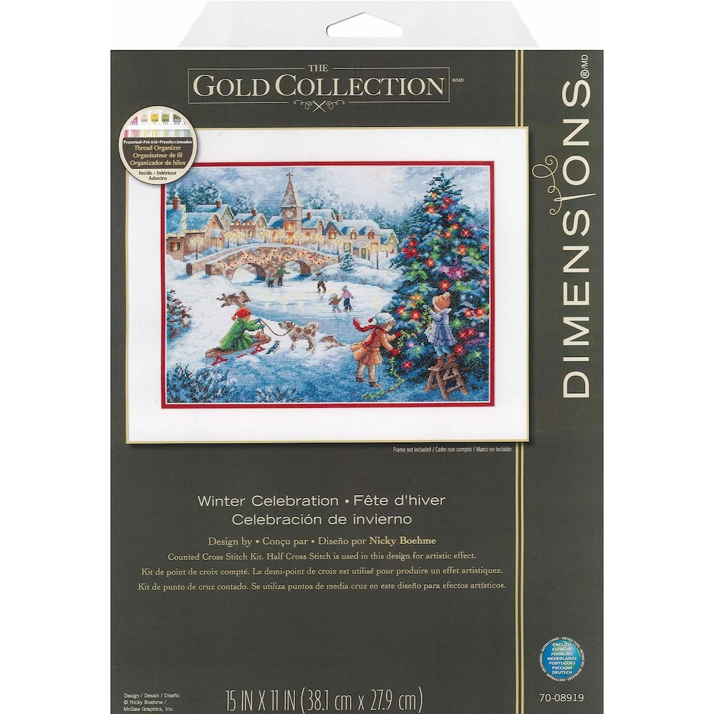 Dimensions Cross Stitch Kits contain everything you need to create a beautiful piece of stitchery art. Cross stitch can be done on even-weave fabric following a print-out grid of the pattern-called counted cross stitch, or on pre-printed fabric-called stamped cross stitch. The Winter Celebration design features a winter ice skating scene on a river near a cobblestone bridge. A village can be seen in the background with children decorating a pine tree with lights in the foreground.
