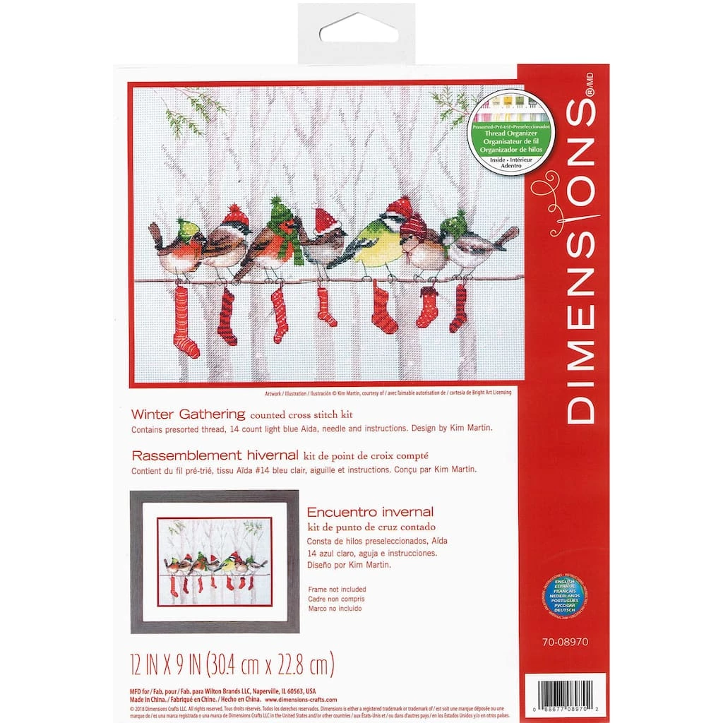 Dimensions Cross Stitch Kits contain everything you need to create a beautiful piece of stitchery art. Cross stitch can be done on even-weave fabric following a print-out grid of the pattern-called counted cross stitch, or on pre-printed fabric-called stamped cross stitch. The Winter Gathering design features seven small birds with Santa hats sitting on a wire above their own stockings.
