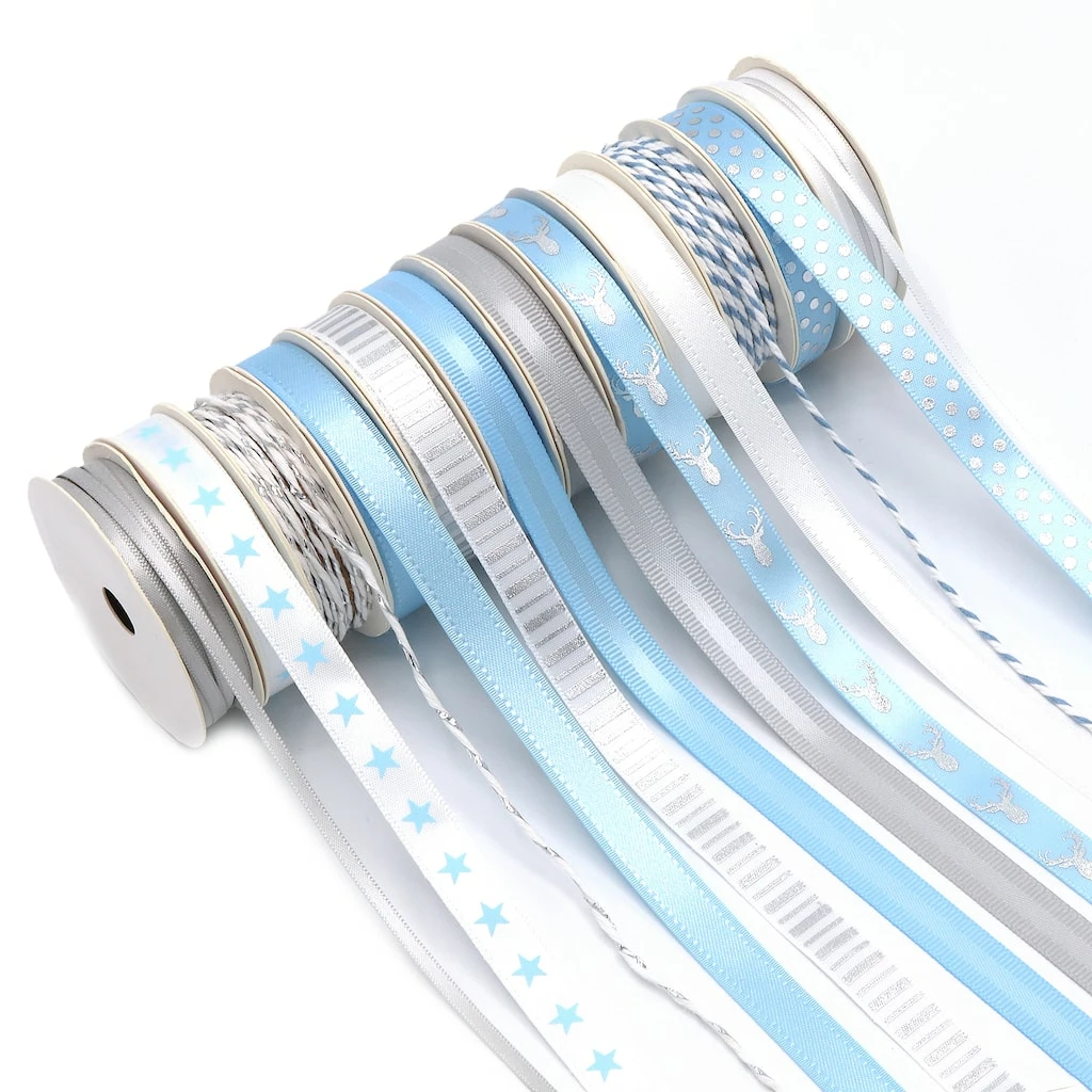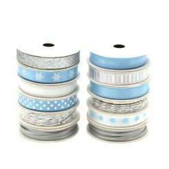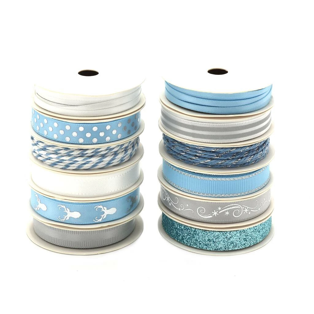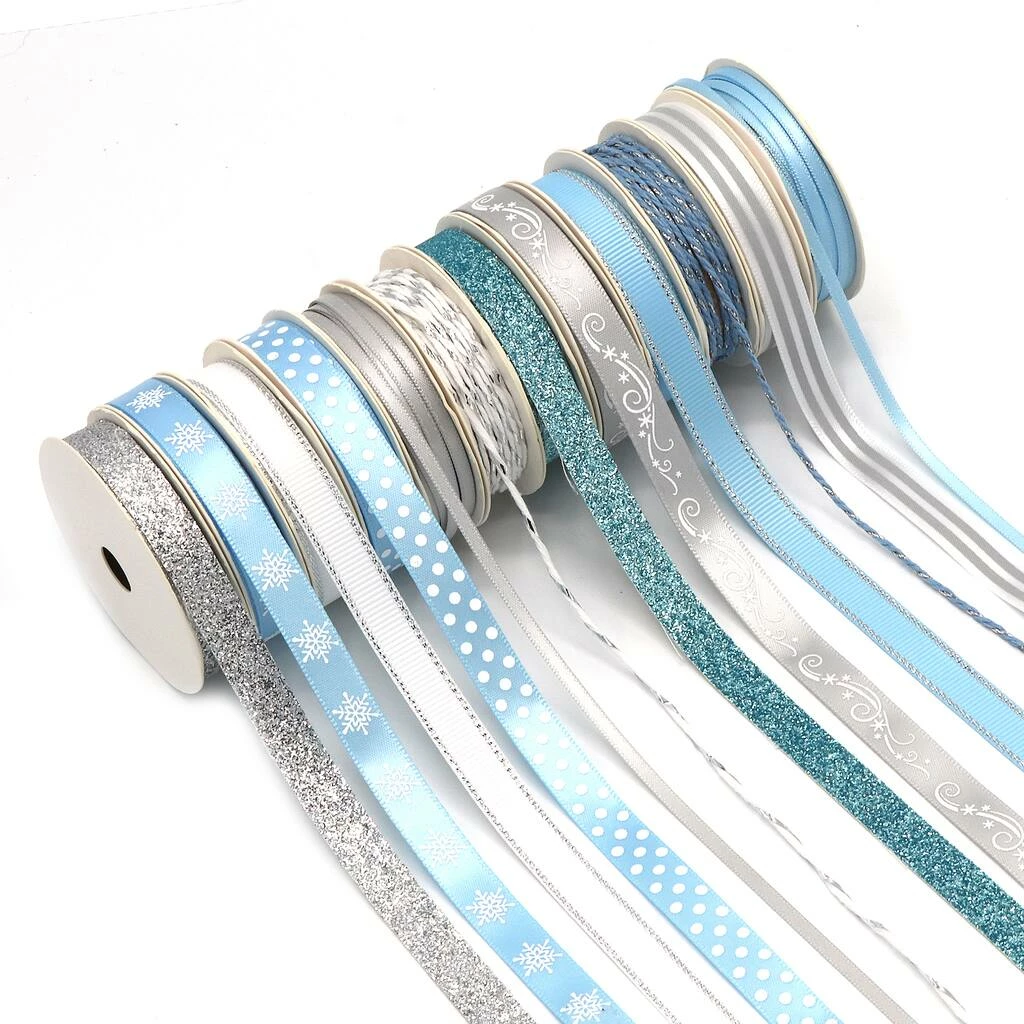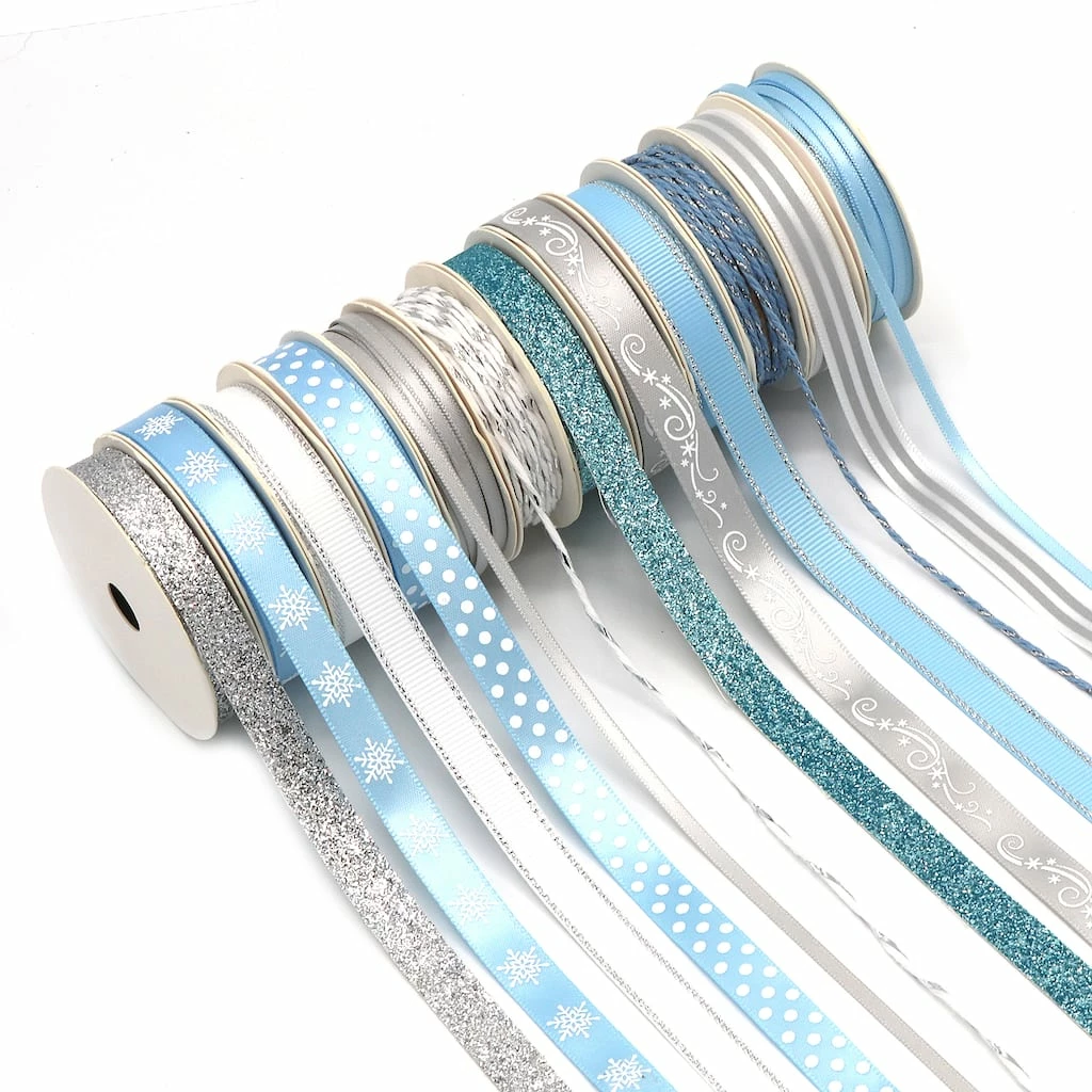 This beautiful blue and silver Holiday Ribbon Assortment includes Grosgrain, Satin, Metallic and twisted Baker’s Twine Ribbon. Perfect for Christmas, Hanukkah gifts and winter crafts. Ribbon come on convenient 2-Yard Spools (total of 48 Yards). Fun prints include Snowflakes, Dots, Stripes, Reindeer and more! So pretty, this ribbon pack will put you in the holiday spirit!