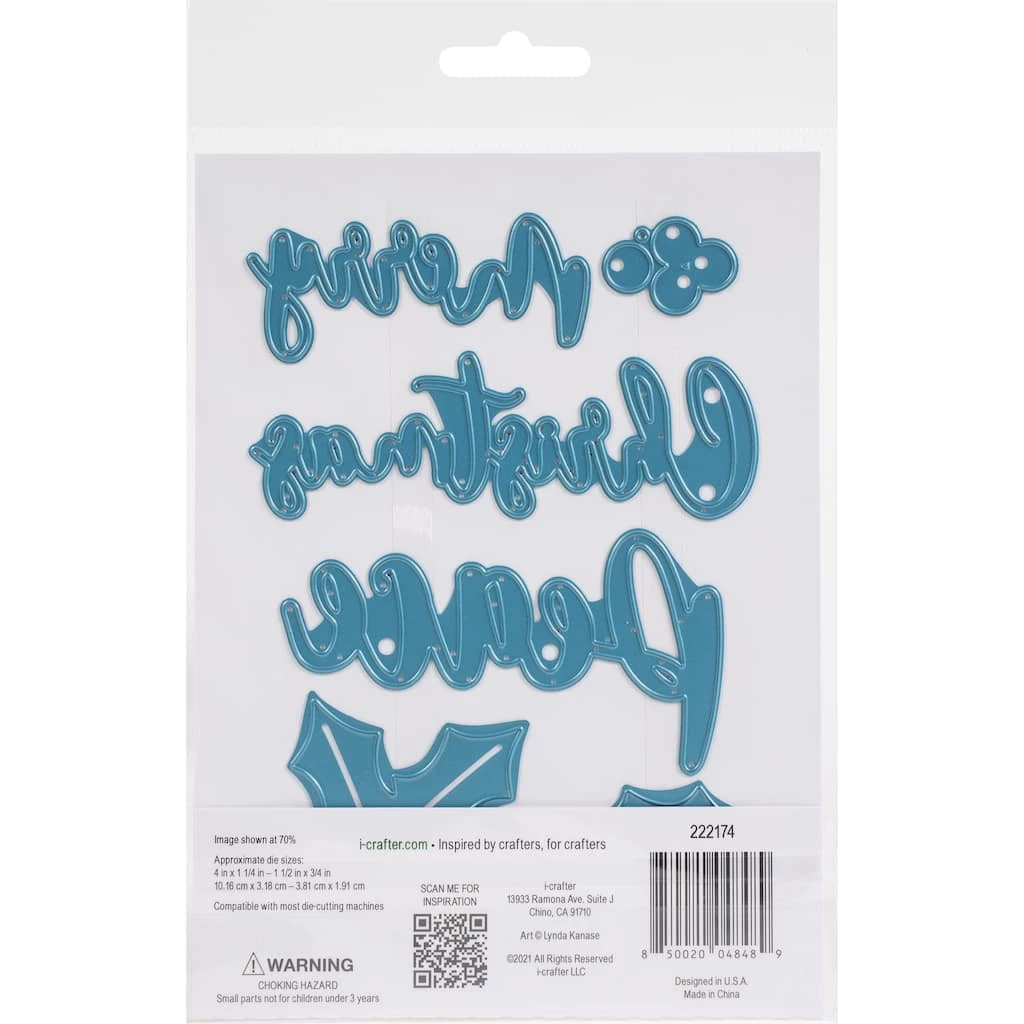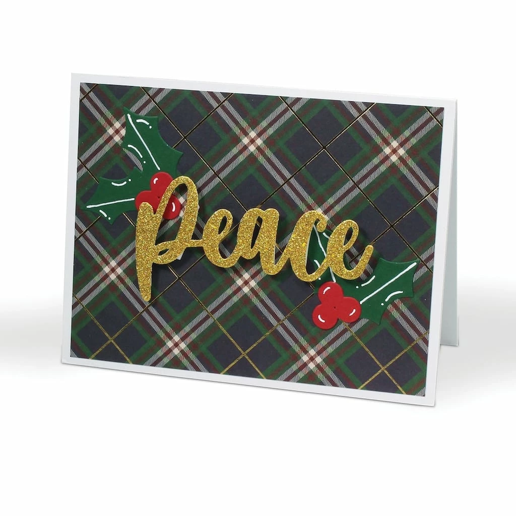 Embellish a festive Christmas card with large, beautiful script words of Merry, Christmas and Peace. Includes holly leaves and berries to add as seasonal accents. Each set contains 6 thin metal dies. Largest word measures 4 x 1.25 inches. Imported.