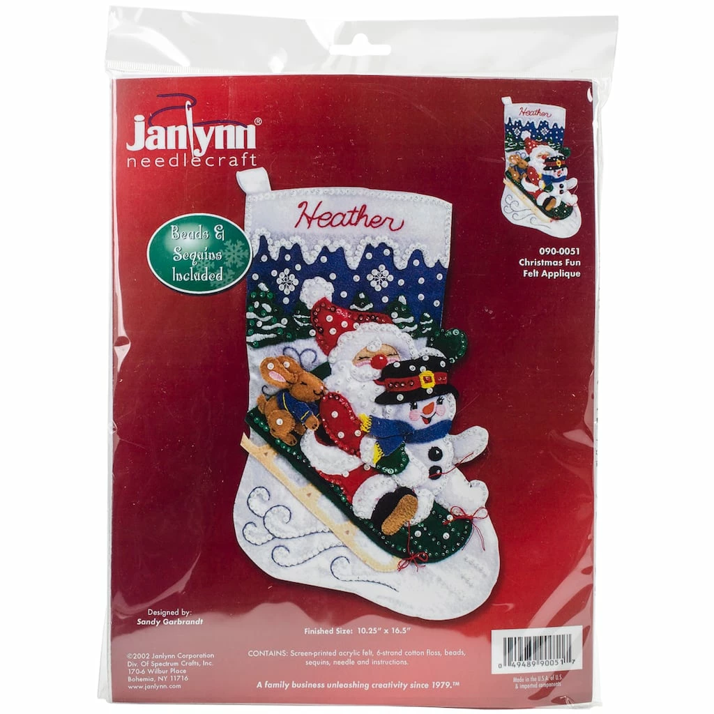 Make a stocking that’s stylish and fun this Christmas! This kit contains screen printed acrylic felt, six-strand cotton floss, beads, sequins, needle and easy to follow instructions.