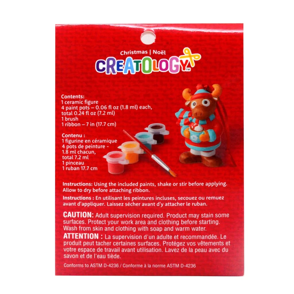 Bring in holiday cheer by painting this ceramic reindeer ornament by Creatology. This kit includes all materials to transform the included piece into a holiday favorite. Once dry and complete, attach ribbon and hang on your Christmas tree.