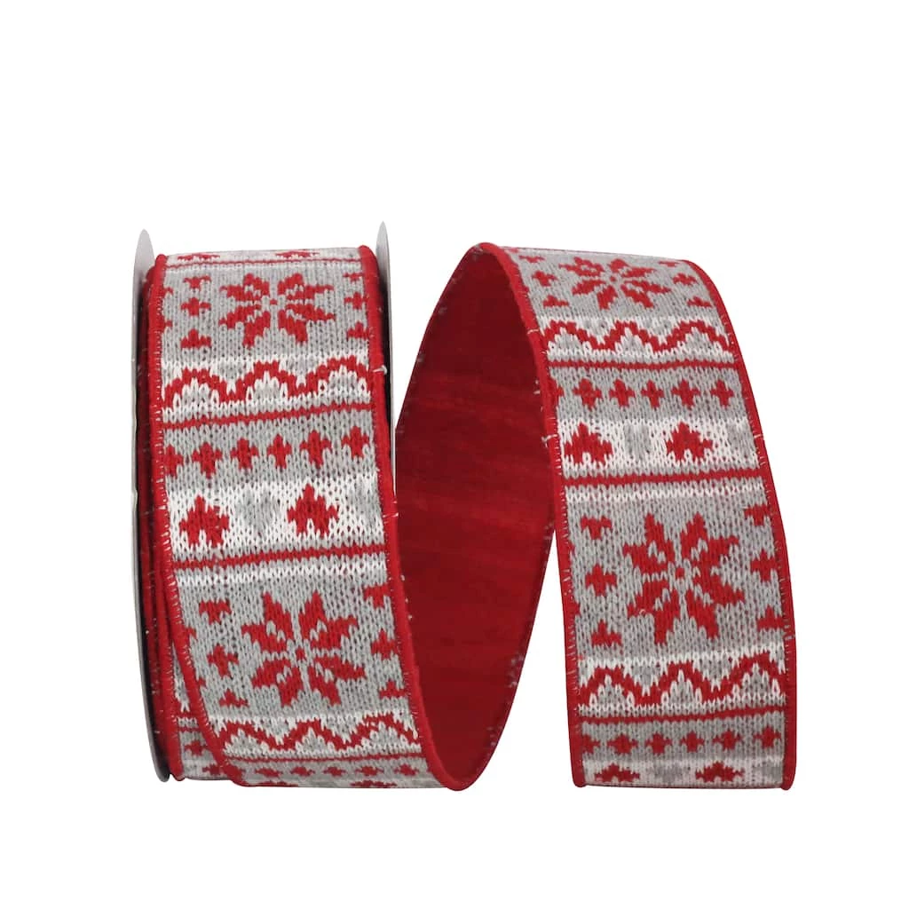 Create a handmade feel with this gray and red knit ribbon that reverses to red. This ribbon is perfect for gift wrapping, craft and DIY projects, holiday decorations and more. It features wired edges for easy bow making.