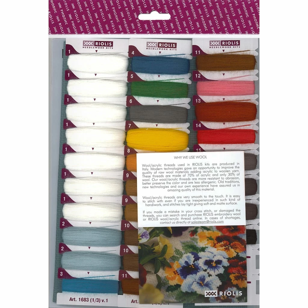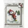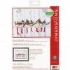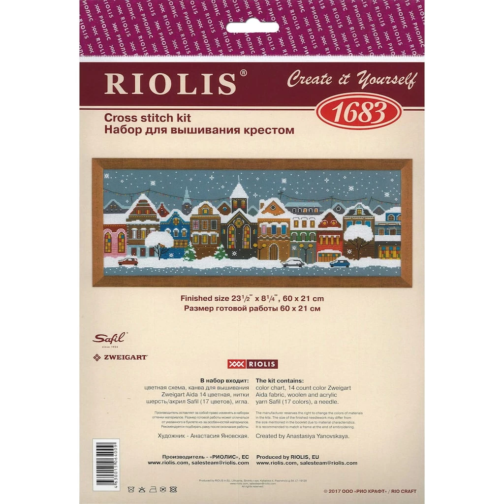 This cross stitch kit contains everything you need to create a charming still life scene of a snow-covered city street with colorful buildings.