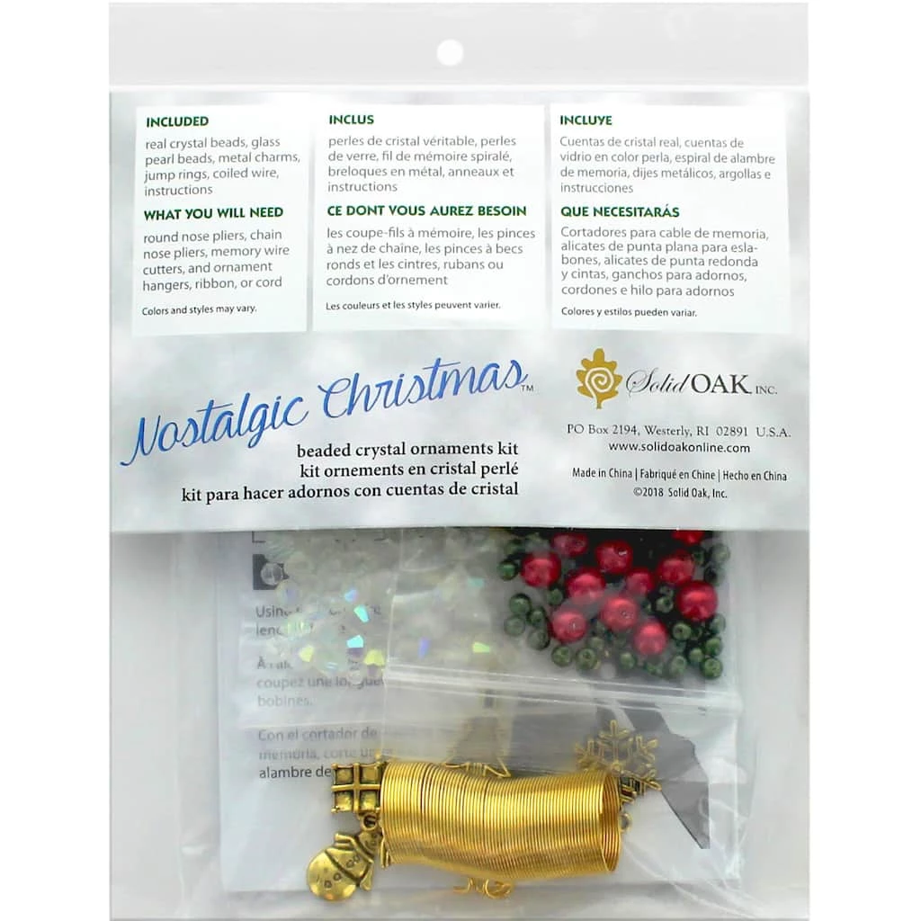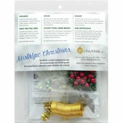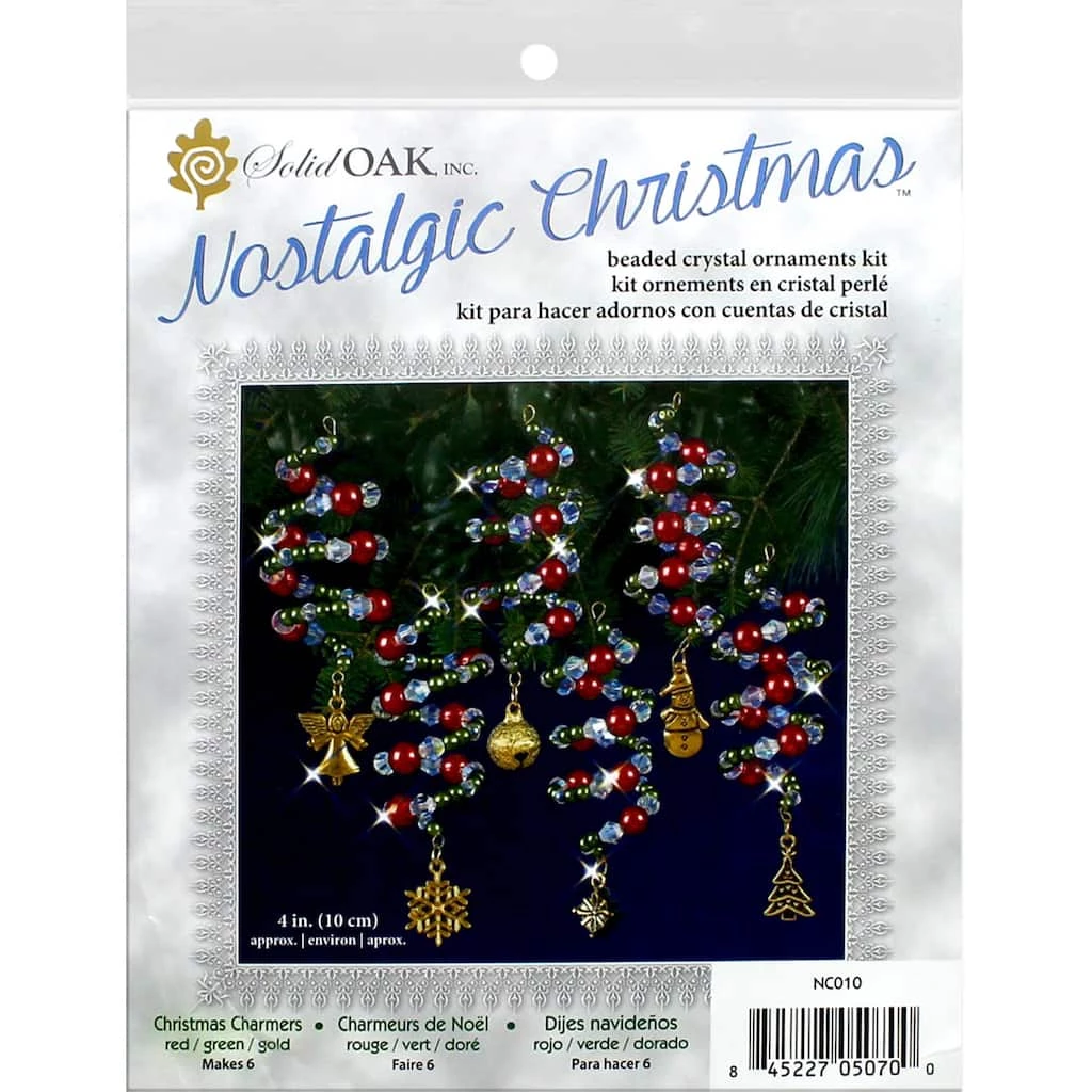 Contains real crystal beads, jewelry-quality glass pearls, gold tone metal charms, memory wire form, and complete instructions. Makes 6 ornaments, each with a different charm: angel, bell, snowman, snowflake, present, and tree.