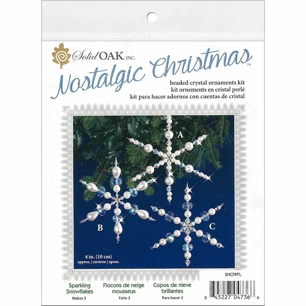 Contains real crystal beads, jewelry-quality glass pearls, silver tone metal beads, snowflake wire form, and complete instructions. Makes one each of three snowflakes.
