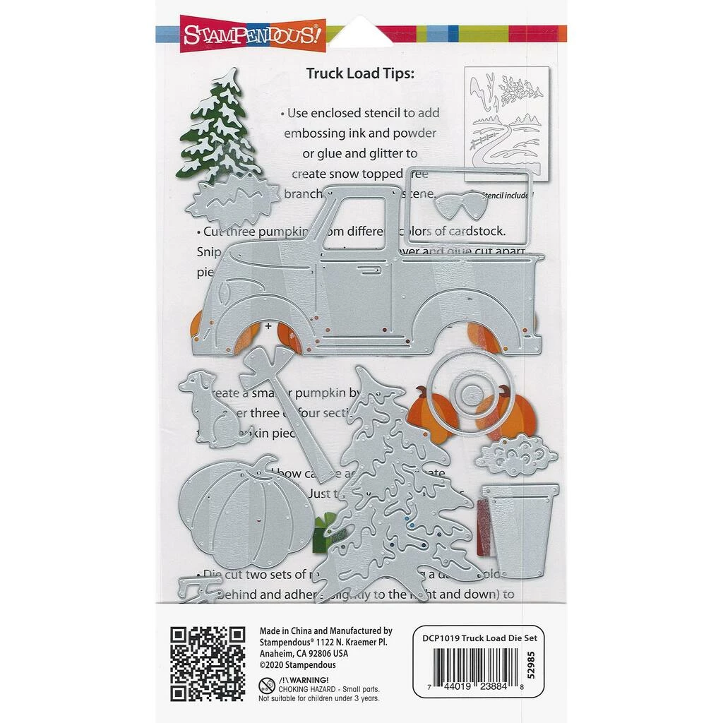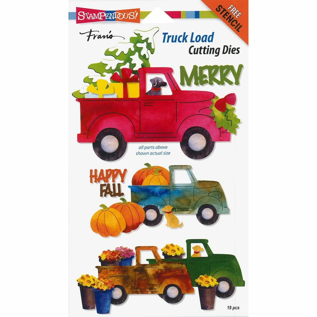 Stampendous Dies alleviate the hassle of having to hand cut detailed paper shapes. These dies will work with most manual die cutting machines. Perfect for cards, scrapbook embellishments, and other art projects. These 19 metal cutting dies create seasonal truck scenes. Designs include: pumpkin, tree, dog, flower buckets, and more. Includes a free stencil for background scenery.