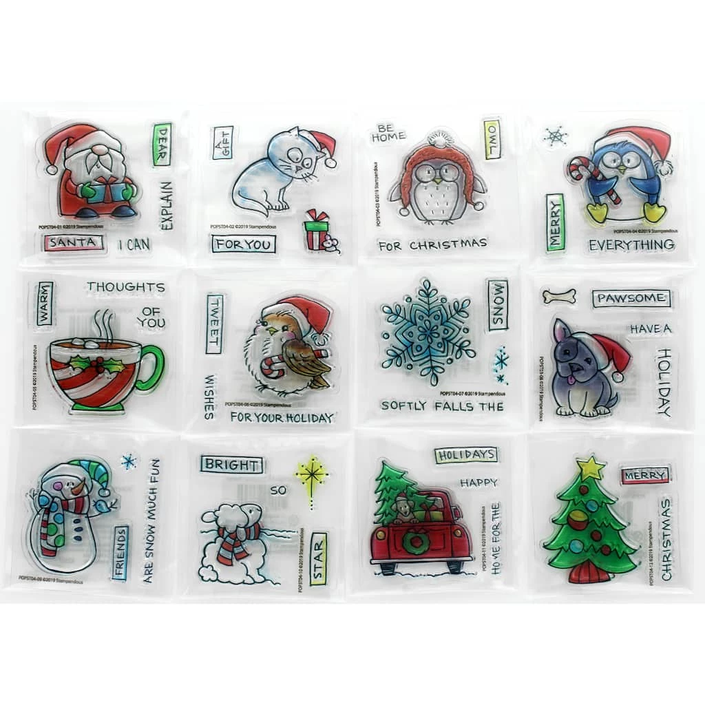 Stampendous Polymer Stamps are clear and easy to position. Perfect for rubber stamping, cards, invitations, and other art projects. Designs include: Santa, penguins, snowmen, cocoa, snowflakes, trees, captions, and more.